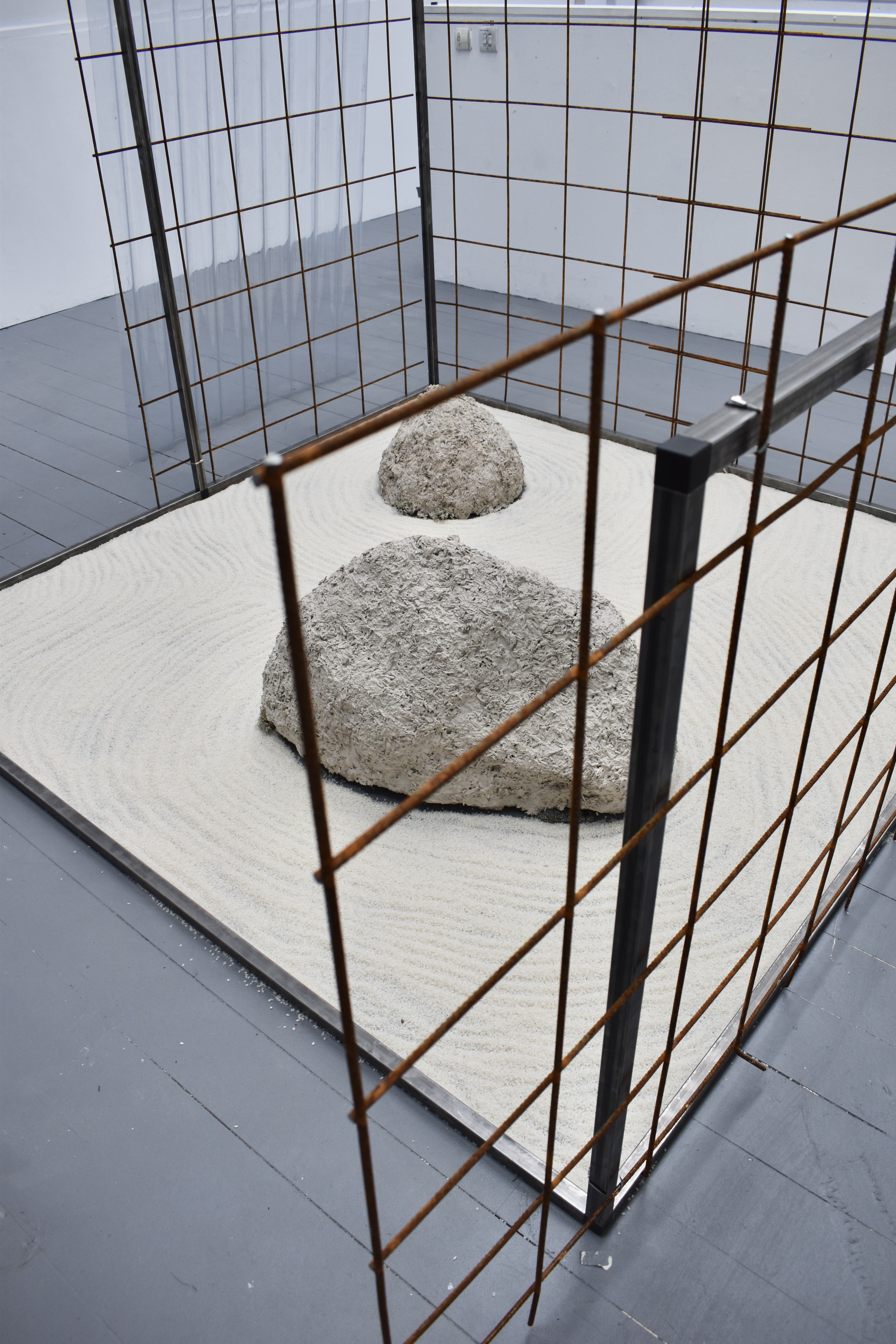 I explore the blurred boundaries within our daily lives through the interplay of identity and architecture. What appears to vaguely be a dry rock garden, are meticulously arranged grains of rice instead of traditional pebbles. The installation takes on an uncanny quality, subverting the expected by challenging what is meant by authenticity and highlighting our innate desire to preserve a world that is in constant flux. The hempcrete boulders, rather than their natural counterparts, are paired with industrial rebar which both paradoxically safeguards and encloses the serene oasis.